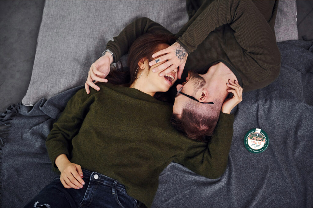 Image Alt Text: A couple lies together on a blanket, laughing and cuddling, with a tin of Revival Ignite cannabis tablets placed beside them.